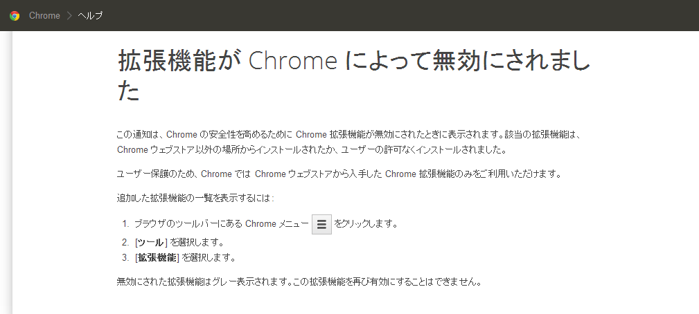 Google chrome を最新バージョンにアップデートすることで chrome ウェブストア以外の場所からインストールされたか ユーザーの許可なくインストールされた可能性がある拡張機能は起動時に自動的に無効化されるようになってしまいました しかも自分で選択して有効化することもできません.