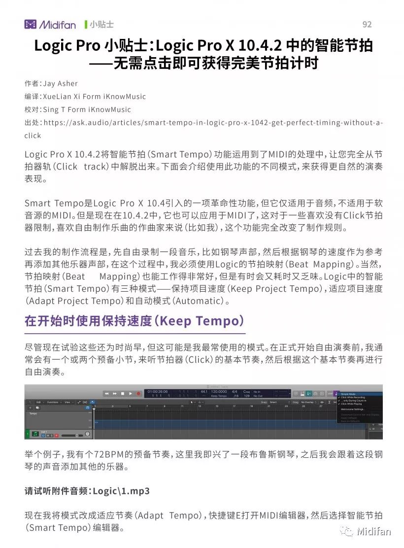 Logic Pro X 中的智能节拍 Smart Tempo 无需点击即可获得完美节拍计时 Midifan 微信公众号文章阅读 Wemp